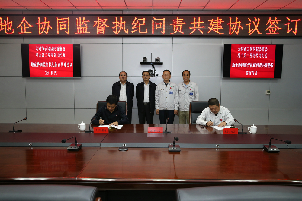 近日,塔山电厂纪委与大同市云冈区纪委监委举行地企协同监督执纪问责共建协议签订仪式,公司主要负责人出席签约仪式。共建协议的签署正式翻开了党风廉政地企共建、深度融合、协同发力的纪检监察工作合作新篇章。