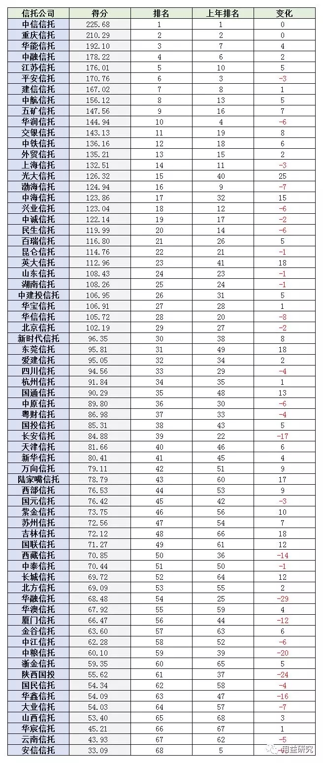 总体来看,2018年信托行业经历了十年高速发展以来的首次下行,也暴露出一些问题和不足之处,这对行业未来发展来说未必是坏事,一些信托公司排名出现了剧烈变动也只是暂时现象。我们相信在资管新规的环境下,信托公司能够看清形势,找准定位和发展方向,发挥自己的优势、适应能力和创新能力,才能在未来的资产管理和财富管理中占有一席之地,继续成为机构投资者和高端人士资产配置的重要组成部分。