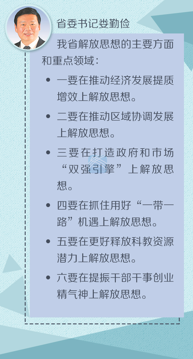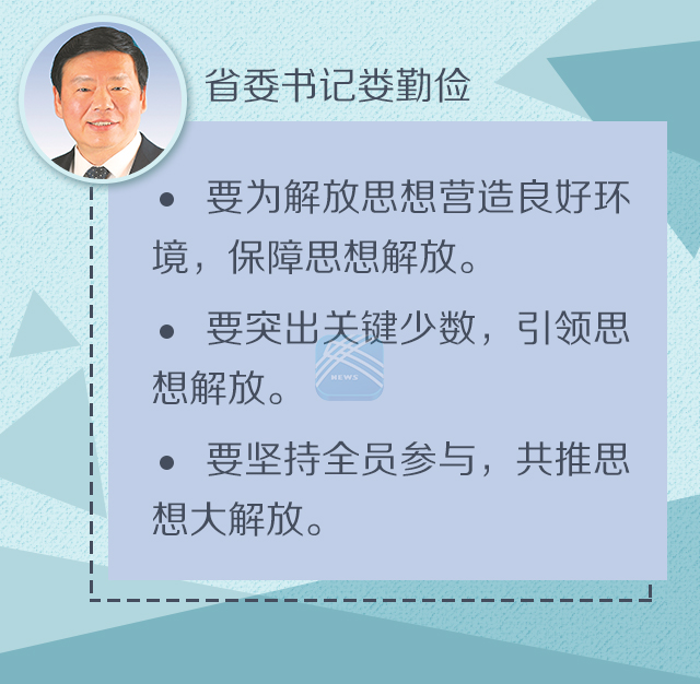 娄勤俭说,解放思想不是解决一时一地问题的权宜之计,而是我们党一以贯之的思想路线。江苏的过去是在解放思想中不断奋进的,江苏的未来也必须在解放思想中砥砺前行。