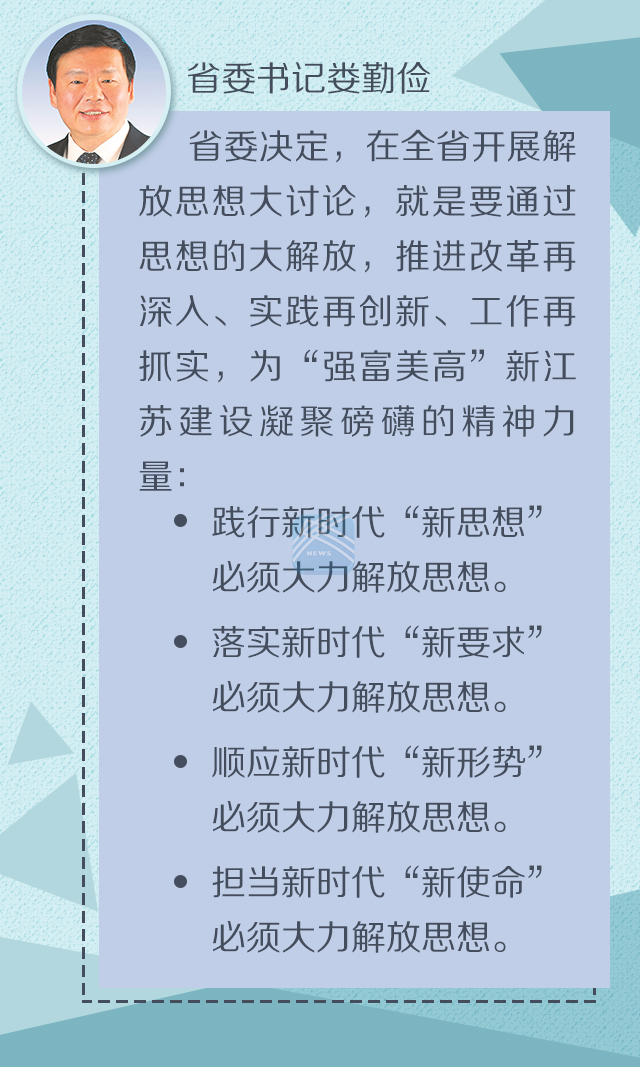 江苏省委决定,在全省开展解放思想大讨论,就是要通过思想的大解放,推进改革再深入、实践再创新、工作再抓实,为“强富美高”新江苏建设凝聚磅礴的精神力量。